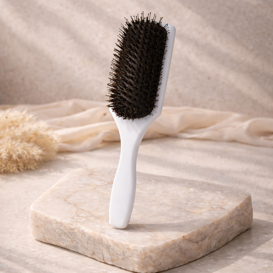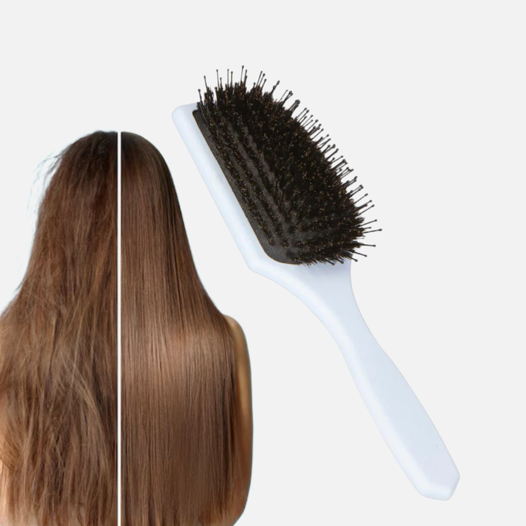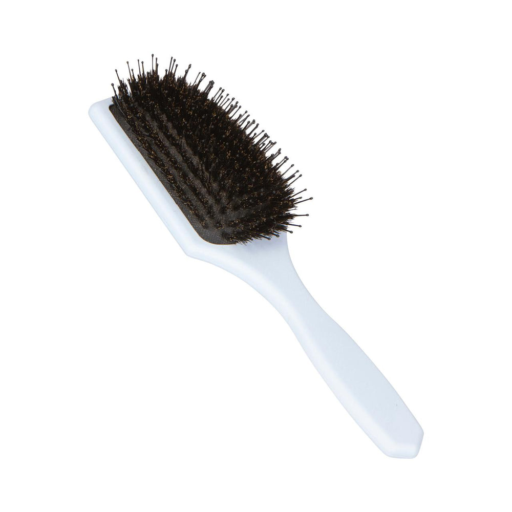 Borsten stimulerar hårbotten och fördelar hårets naturliga oljor ut i längderna, vilket ger en frisk glans och hjälper håret att ligga på plats hela dagen. De fina, tätt sittande stråna som imiterar svinhår minskar dessutom statisk elektricitet och ger ett slätare, mer polerat resultat.